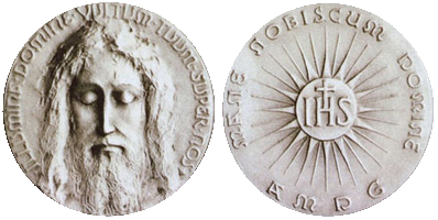 Alla ricerca di un’immagine per la medaglia, madre Pierina s’imbatte in una fotografia della Sindone che riproduce il Volto di Gesù. Un’immagine già nota a Milano, dal momento che il fotografo ne aveva fatto dono all’arcivescovo della città, il beato cardinale Ildefonso Schuster, il quale, a sua volta, l’aveva intronizzata con la massima devozione in una chiesa dedicata proprio al Santo Volto.