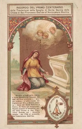 Dopo una vita spesa in veglie e preghiere, S. Savina morì (a. 311/317) e fu sepolta prima accanto ai “suoi” martiri e successivamente verrà sepolta in Sant’Ambrogio dove a lei è dedicata una cappella, ed in città è venerata come protettrice delle madri.