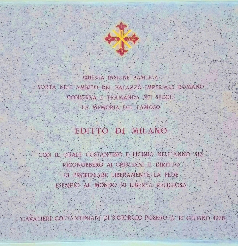 A Milano venne costruito un sontuoso palazzo imperiale che fu sede di una importantissima decisione per la religione cristiana. Di questo palazzo rimangono pochi resti, e su questi fu edificata una chiesa. Infatti chi si trovi oggi ad entrare nella basilica di San Giorgio al Palazzo, in via Torino, si imbatte nella seguente epigrafe: “Questa insigne basilica, sorta nell’ambito del palazzo imperiale romano, conserva e tramanda nei secoli la memoria del famoso Editto di Milano con il quale Costantino e Licinio, nell’anno 313, riconobbero ai cristiani il diritto di professare liberamente la fede, esempio al mondo di libertà religiosa“.