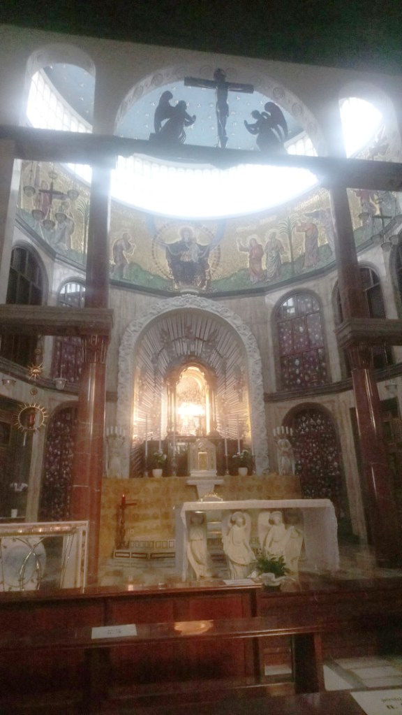 Nella fascia absidale sopra la nicchia, un mosaico rappresenta l’universale mediazione e regalità della Madre di Dio.