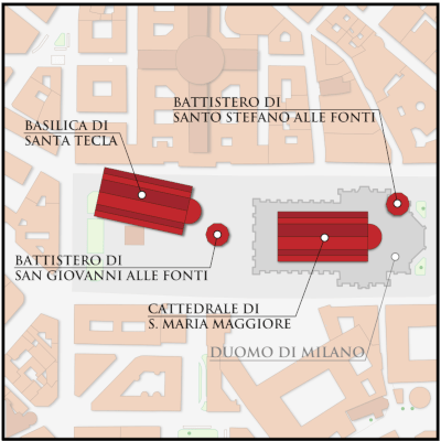 La basilica di Santa Tecla fu un’antica basilica paleocristiana di Milano, oggi non più esistente, che si trovava su quella che è ora piazza del Duomo, di fronte all’odierna Cattedrale. Fu realizzata nel 350, ovvero negli anni immediatamente successivi all’Editto di Costantino del 313, nel periodo in cui Mediolanum (la moderna Milano) era capitale dell’Impero romano d’Occidente (ruolo che ricoprì dal 286 al 402).