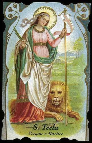 Secondo la tradizione, Santa Tecla di Iconia era una discepola di San Paolo, ma non si conosce né la sua data di nascita né quella della sua morte. Incominciò a seguire il santo quando venne a predicare nella sua città natale, e dopo la sua conversione si sottrasse ad un matrimonio combinato. Quando sua madre lo seppe, istigò il governatore della città a condannarla a morte, ma venne salvata per miracolo dal rogo, ed in seguito si recò da Paolo per ricevere il battesimo e seguirlo.