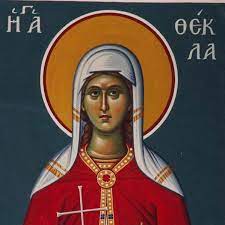 Secondo la tradizione, Santa Tecla di Iconia era una discepola di San Paolo, ma non si conosce né la sua data di nascita né quella della sua morte. Incominciò a seguire il santo quando venne a predicare nella sua città natale, e dopo la sua conversione si sottrasse ad un matrimonio combinato. Quando sua madre lo seppe, istigò il governatore della città a condannarla a morte, ma venne salvata per miracolo dal rogo, ed in seguito si recò da Paolo per ricevere il battesimo e seguirlo.